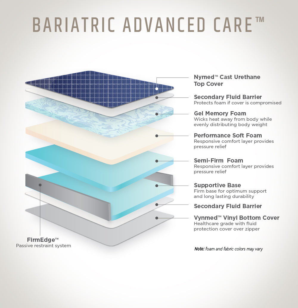Our Bariatric Advanced Care™ General Patient and ICU/CCU Hospital Bed Memory Foam Mattresses is the next step up from our Assure Med-Surg Mattress. Mattresses are multi-layered, multi-density for optimal comfort and postural support. All Advanced Care™ mattresses come with a double thickness top layer of revolutionary Viscotech™ gel infused memory foam along with a Nymed™ polyurethane coated healthcare nylon top, 210 denier; soft never brittle, and a Vynmed™ healthcare polyurethane coated vinyl bottom making this ultimate mattress perfect for an exceptional night of rest.